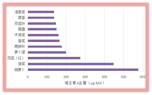 植物性食物中的β-胡蘿卜素可以轉(zhuǎn)化為維生素A,是我國居民膳食維生素A的主要來源。圖3是一些常見深色蔬菜中的維生素A生物活動當(dāng)量,中國居民維生素A推薦攝入量(RNI)成年女性和男性分別為700、800 ?gRAE/d,100g胡蘿卜中基本可以達(dá)到成年女性一天的維生素A需要量的83%。