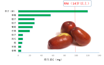 多數(shù)新鮮水果含水量85%~90%,富含維生素C、鉀、鎂和膳食纖維(纖維素、半纖維素和果膠)。紅色和黃色水果(如芒果、柑橘、木瓜、山楂、沙棘、杏、刺梨)中b-胡蘿卜素含量較高;棗類(鮮棗、酸棗)、柑橘類(橘、柑、橙、柚)和漿果類(獼猴桃、沙棘、黑加侖、草莓、刺梨)中維生素C含量較高;香蕉、黑加侖、棗、紅果、龍眼等的鉀含量較高。成熟水果所含的營養(yǎng)成分一般比未成熟的水果高。