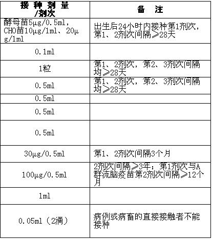 注:1. CHO疫苗用于新生兒母嬰阻斷的劑量為20μg/ml。 2. 未收入藥典的疫苗,其接種部位、途徑和劑量參見疫苗使用說明書。